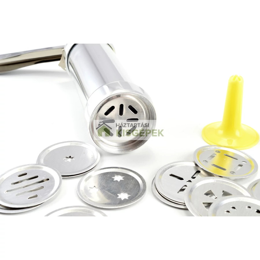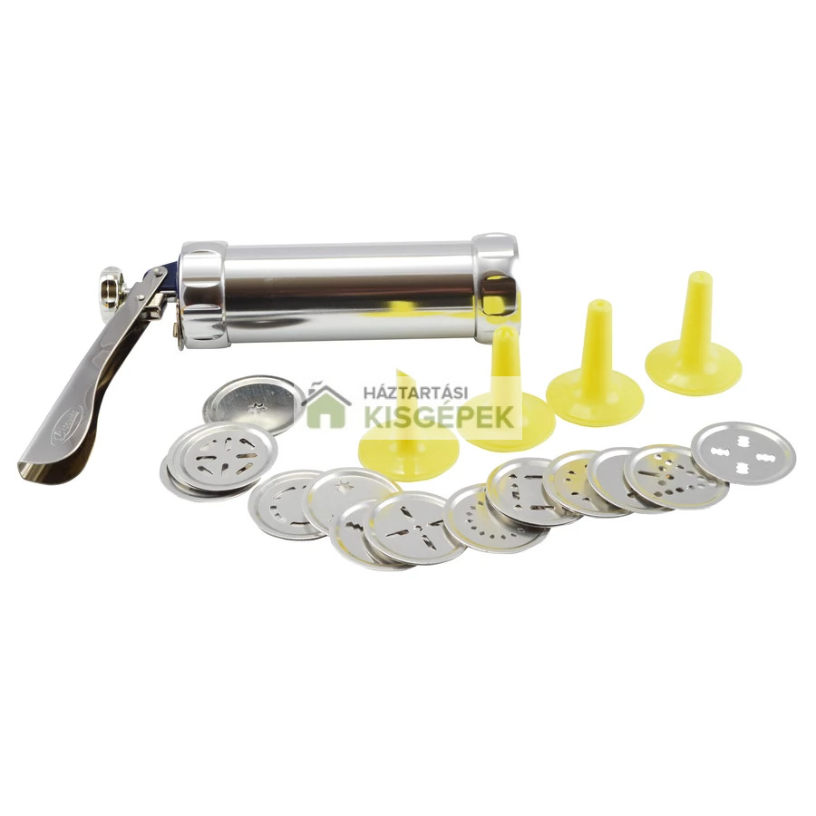 A Perfect Home sütikinyomó és keksz készítő szett egyszerűvé és kreatívvá teszi a sütést! A készlet tartalmaz 1 db alumínium házas kinyomó készüléket, 4 db műanyag habkinyomó fejet és 20 féle fém sütiformát, amelyekkel változatos, kb. 5 cm-es kekszek készíthetők. Ideális vajas kekszhez, mézeskalácshoz vagy habcsókhoz, de tortadíszítéshez is tökéletes. Strapabíró, könnyen tisztítható és időtakarékos megoldás, amellyel minden sütemény egyforma és mutatós lesz. Kiváló választás otthoni sütéshez vagy akár karácsonyi ajándéknak is.