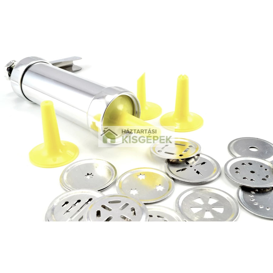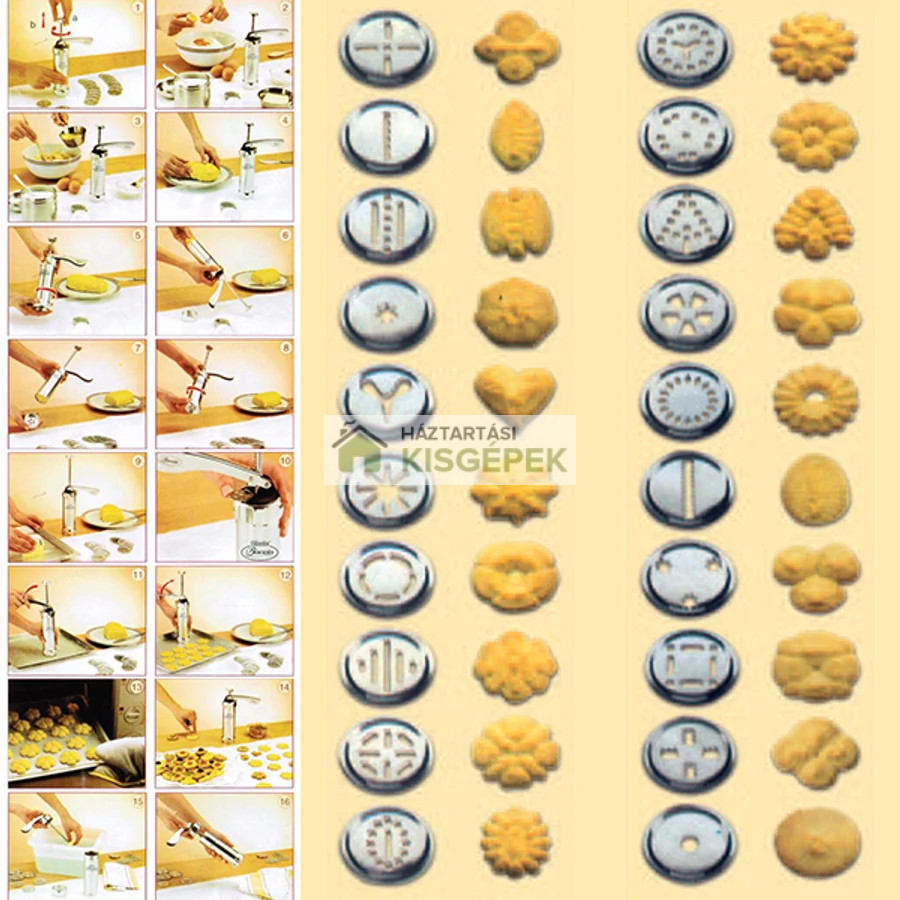 A működés pofonegyszerű: a tésztát a kinyomóba kell tölteni, majd a választott formát rögzíteni a készülék végén. A kar vagy nyomó mechanizmus segítségével a tészta átpréselődik a formán, és máris egyforma méretű, mutatós kekszek kerülnek a sütőpapírra.